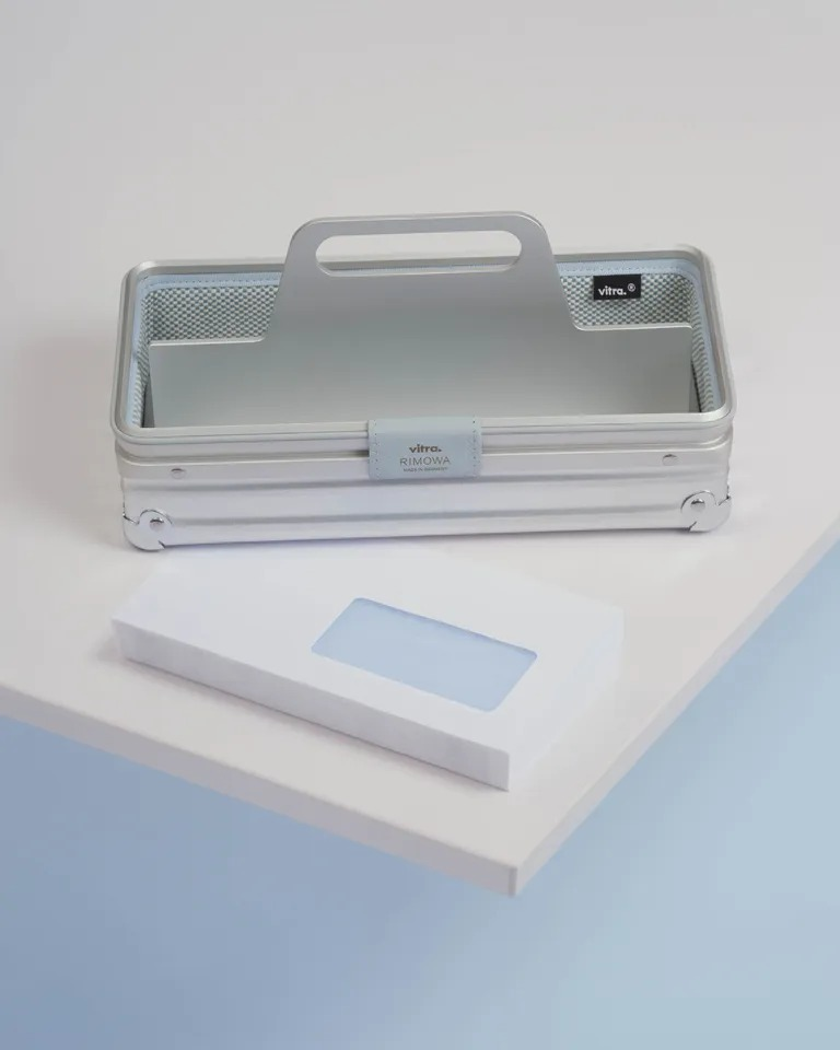 A caixa de ferramentas, por sua vez, é uma reinterpretação sofisticada da Vitra Toolbox original. Limitada a apenas 100 unidades, ela combina o corpo em alumínio ranhurado com compartimentos internos de tecido reciclado. O resultado é uma peça utilitária com presença escultural.