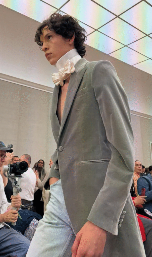 Casacos de veludo espesso e bordados inspirados em retratos do século XVIII se justapõem a malhas desfiadas, denim cru, silhuetas sem rigidez. Nada busca perfeição. Tudo comunica contraste. O luxo, aqui, não se exibe — se estranha.