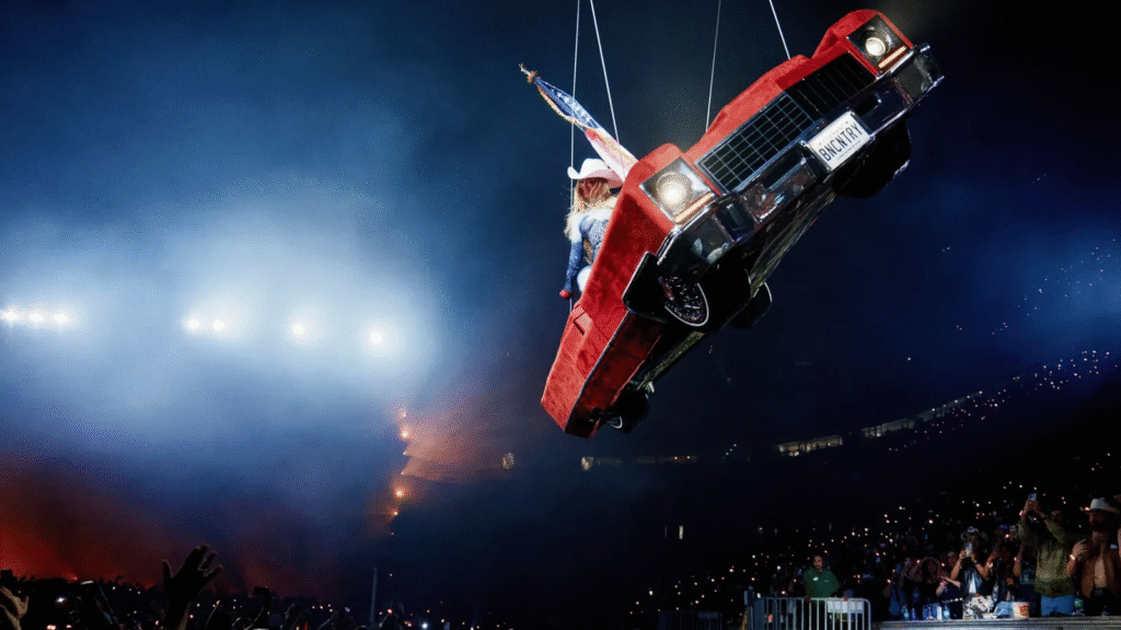 No encerramento do espetáculo, a artista surgiu no ar, a bordo de um Cadillac vermelho suspenso por cabos sobre o público. Era um dos momentos mais esperados da turnê. Mas, dessa vez, o equipamento falhou.