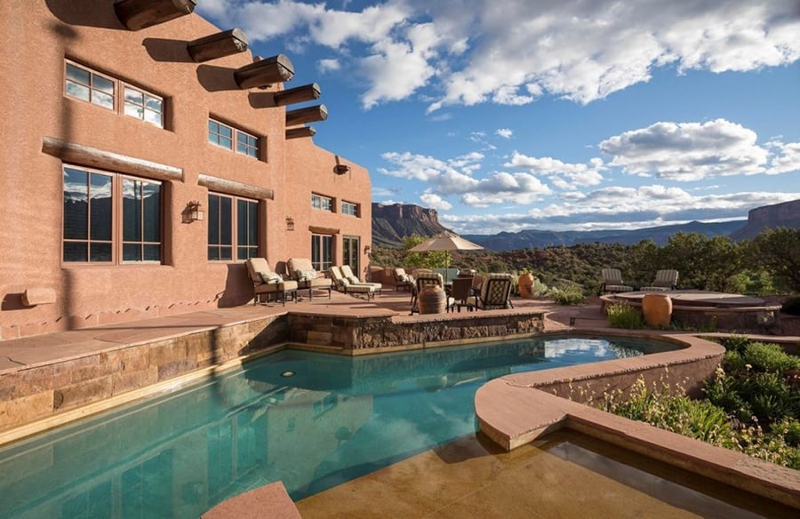 Alt text: Piscina resort do West Creek Ranch com vista para o cânion