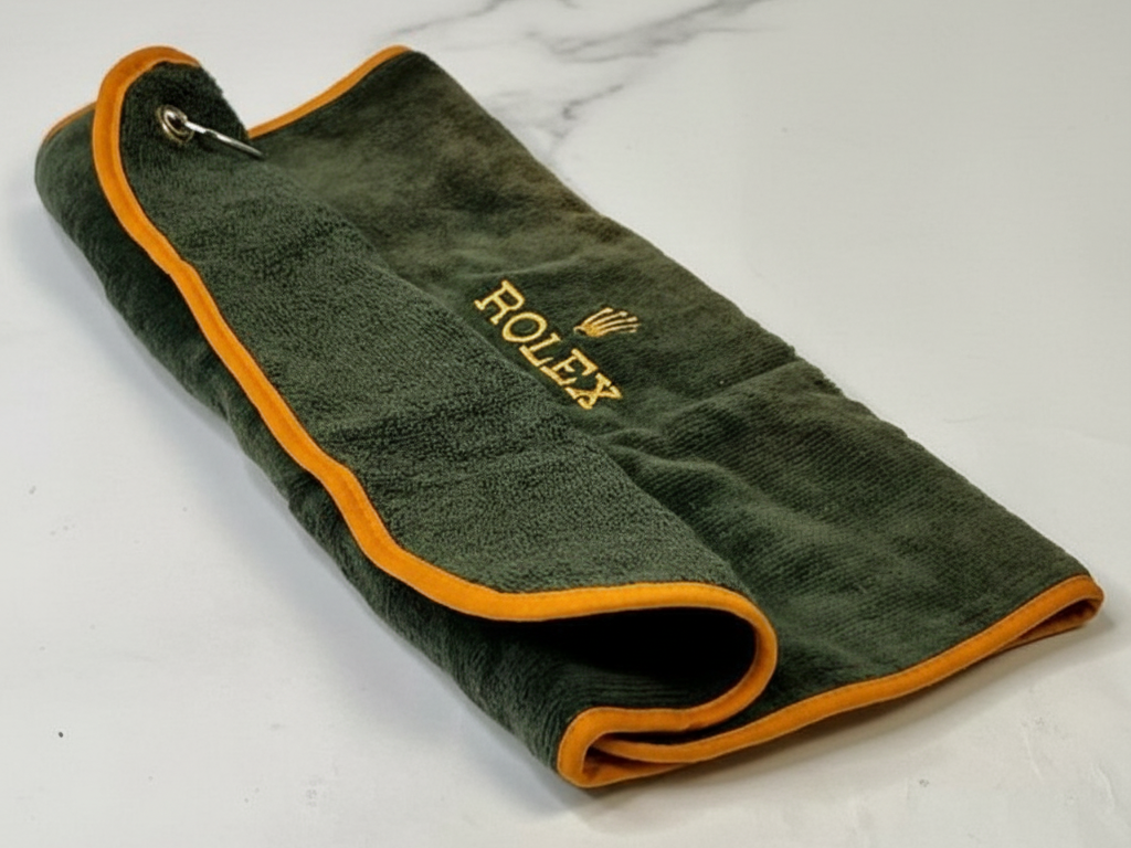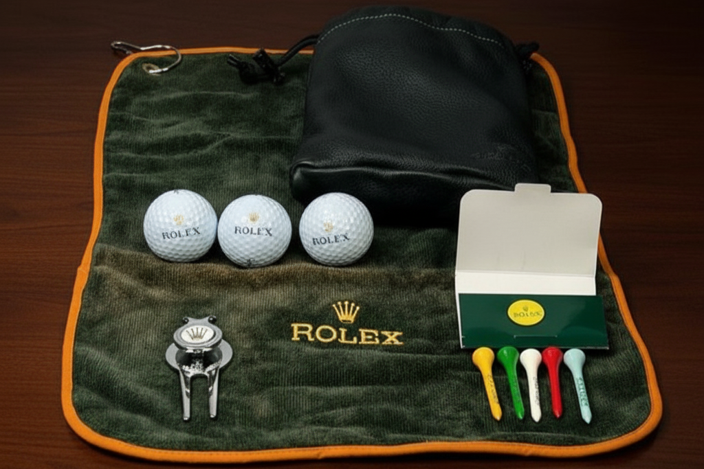 O conjunto reunia três bolas de golfe personalizadas, uma ferramenta de divot cromada com marcador magnético patenteado, tees de madeira coloridos e uma toalha de microfibra verde com borda laranja. Tudo era acondicionado em uma bolsa de couro verde com a coroa da Rolex em destaque.