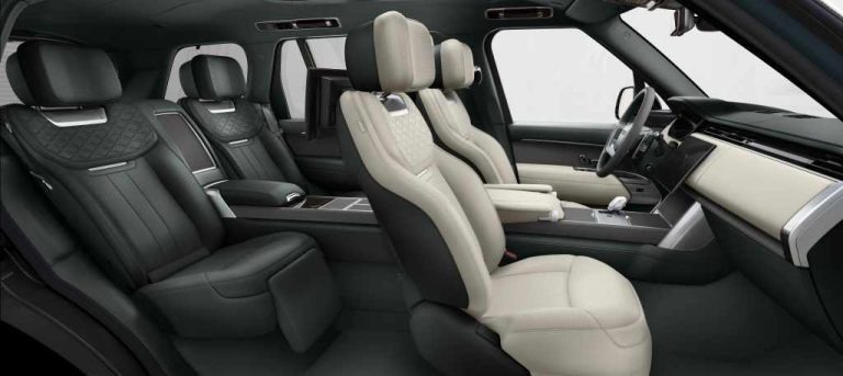 O Range Rover SV oferece assentos Executive com apoio estendido para as pernas e múltiplas opções de ajuste. O console central retrátil permite transformar o espaço traseiro em área de trabalho ou descanso. A marca utiliza cerâmica de sinterização, um processo que proporciona textura suave e durabilidade elevada. Os folheados incluem opções sustentáveis e madeira proveniente de florestas manejadas. O interior transmite discrição e equilíbrio.