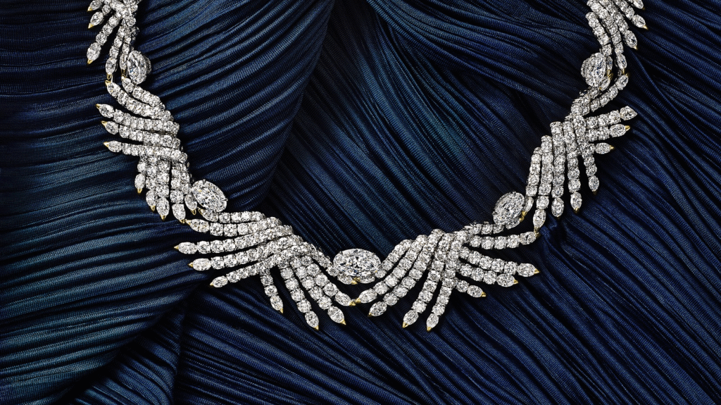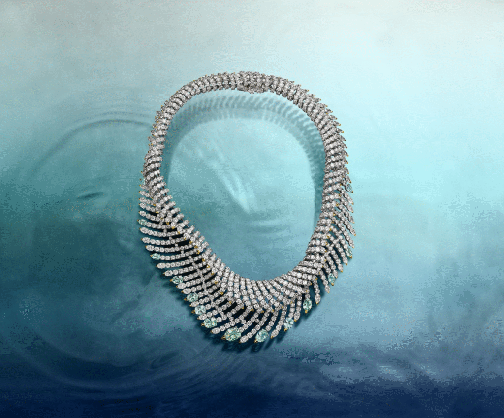 Entre as peças selecionadas pelo Jetsetters Select está o Colar Sea of Wonder High Jewelry, desenvolvido em platina com diamantes de lapidação mista em arranjos fluidos. Um design que transmite a sensação de correnteza, onde cada pedra é escolhida individualmente pelos mestres lapidadores da Tiffany.