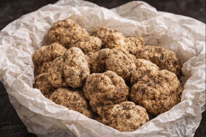 No topo dessa hierarquia está a Trufa Branca de Alba, encontrada apenas no Piemonte italiano durante o inverno. Ela concentra raridade extrema, curta temporada e o aroma mais complexo da gastronomia. Em anos de colheita rara, seus preços na Europa podem superar €8.000 a €10.000 por quilo, enquanto no Brasil valores acima de R$ 50.000 por quilo não são incomuns em operações sob encomenda. Seu perfume delicado não tolera calor direto. Por isso, nunca é cozida. É laminada crua sobre pratos quentes, onde libera seu aroma sem se perder.