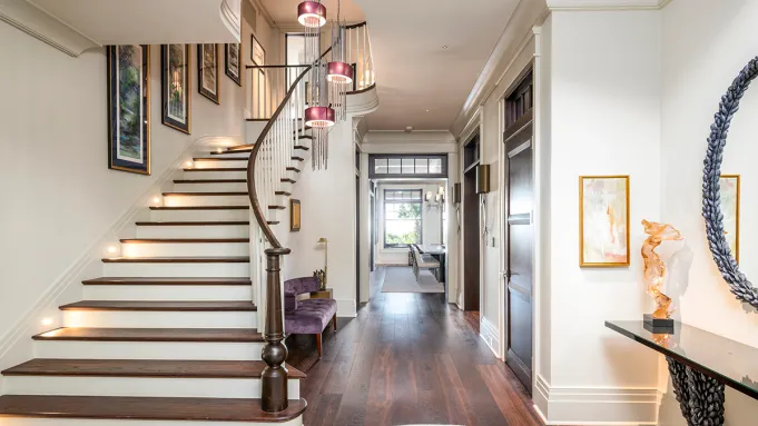 A entrada principal é marcada por um hall de três pavimentos com escadaria curva, que conduz a áreas sociais voltadas para o mar. Sala de estar e jantar compartilham o mesmo eixo visual e se abrem para grandes janelas com bancos embutidos. A cozinha em tom azul-claro concentra eletrodomésticos de alto desempenho e se conecta a uma sala de café da manhã e a uma adega revestida em madeira.