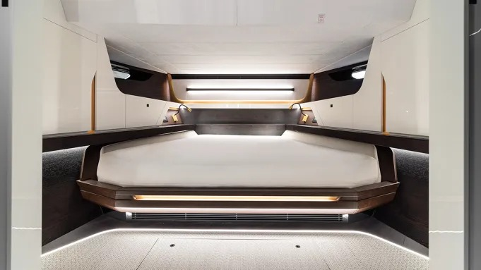 No convés, a proposta prioriza entretenimento e circulação fluida. Bares integrados, geladeiras e churrasqueira reforçam o conceito de weekend yacht. A plataforma de popa garante acesso direto ao mar, enquanto duas garagens acomodam botes e brinquedos aquáticos.