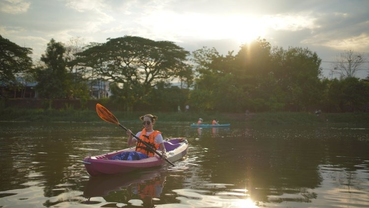 A natureza também aparece em experiências simples e memoráveis. No rio Mae Taeng, jangadas de bambu descem lentamente pela corrente enquanto elefantes caminham pelas margens e a floresta se fecha ao redor do rio.