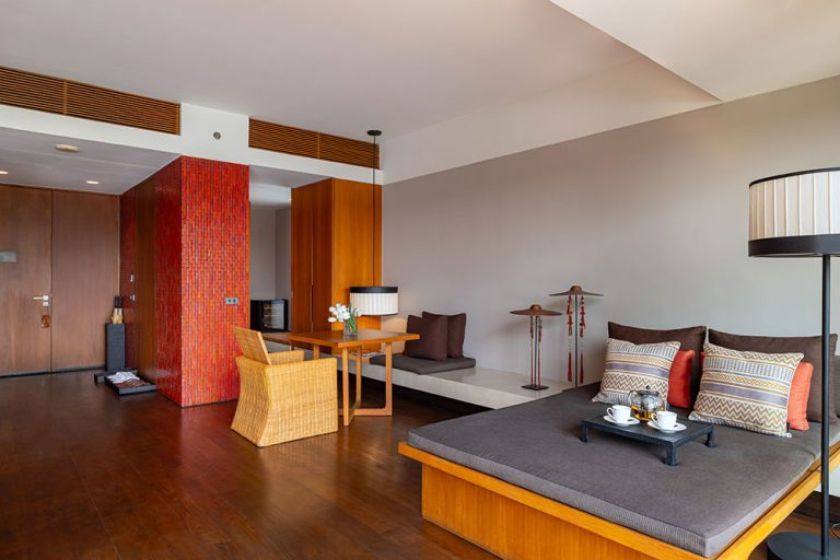 Da varanda, o olhar acompanha o fluxo lento do rio Mae Ping e encontra o antigo Consulado Britânico, hoje integrado ao resort. O edifício colonial convive com a estética minimalista do arquiteto Kerry Hill e com elementos da cultura Lanna.